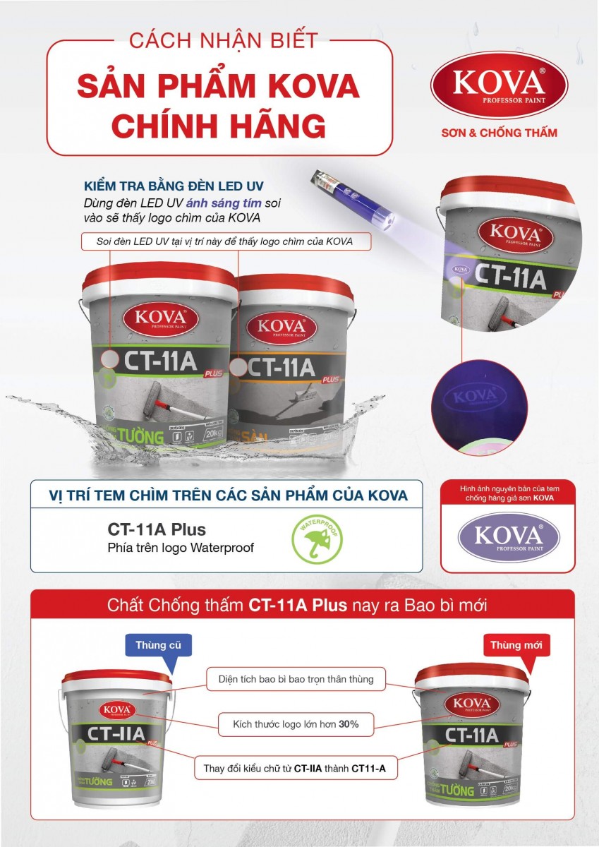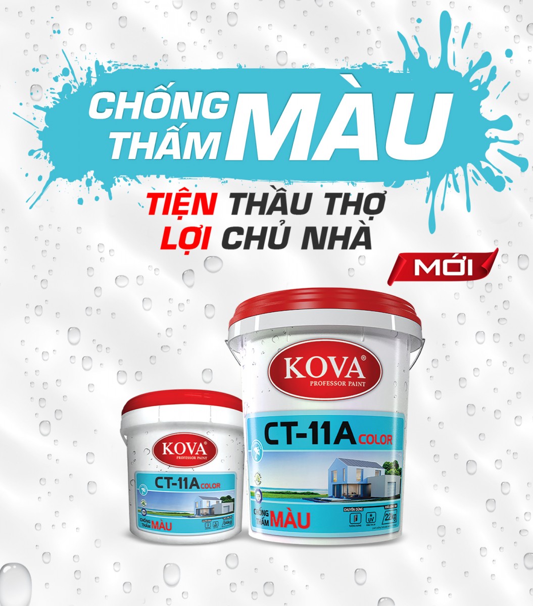 Sơn chống thấm Kova pha xi măng còn được biết đến với tên sơn chống thấm Kova CT11A. Loại sơn này được sử dụng để ngăn chặn hiện tượng thấm dột của nước trong thi công và xây dựng.