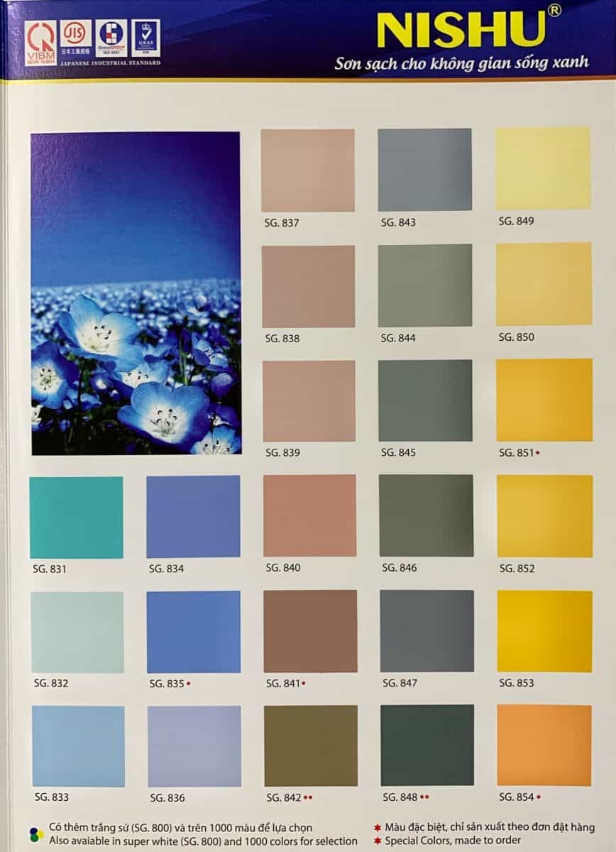– Bảng màu sơn epoxy Nishu đa dạng, lên màu chuẩn với màng sơn bền đẹp và có độ phủ cao.